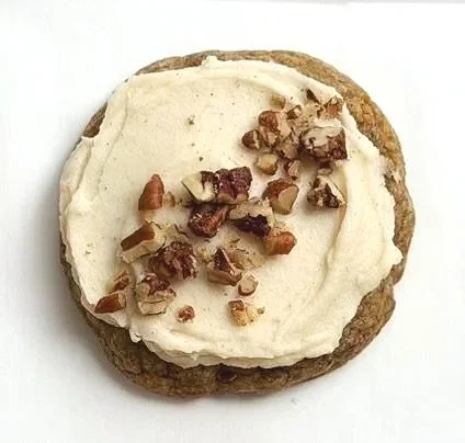 A soft, spiced cookie filled with warm cinnamon, ginger, and nutmeg—bringing all the cozy flavours of classic carrot cake into every bite, topped with cream cheese flavoured icing and finished with candied pecans.