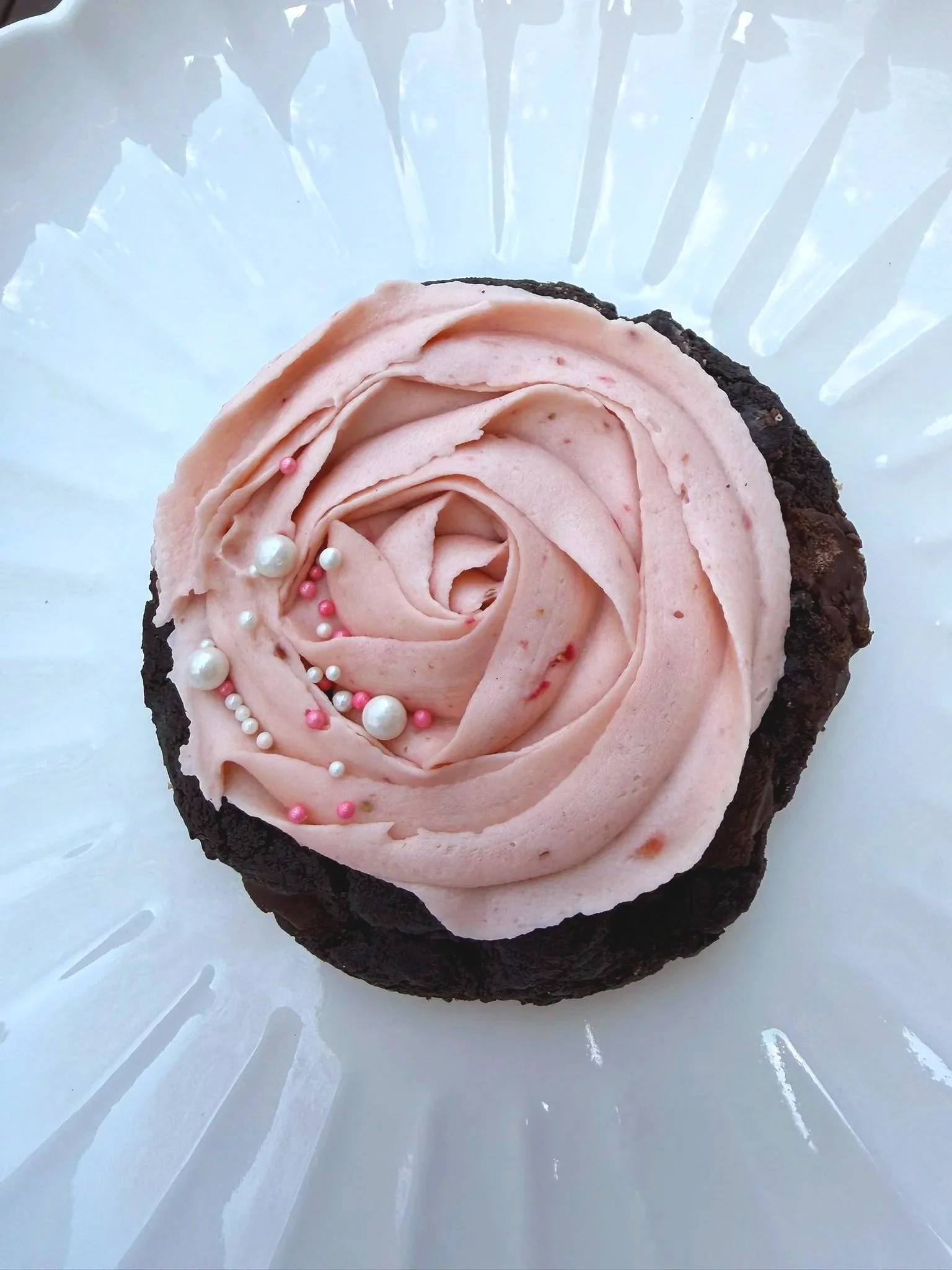 A rich, fudgy chocolate cookie topped with a creamy strawberry frosting- tastes like a chocolate covered strawberry