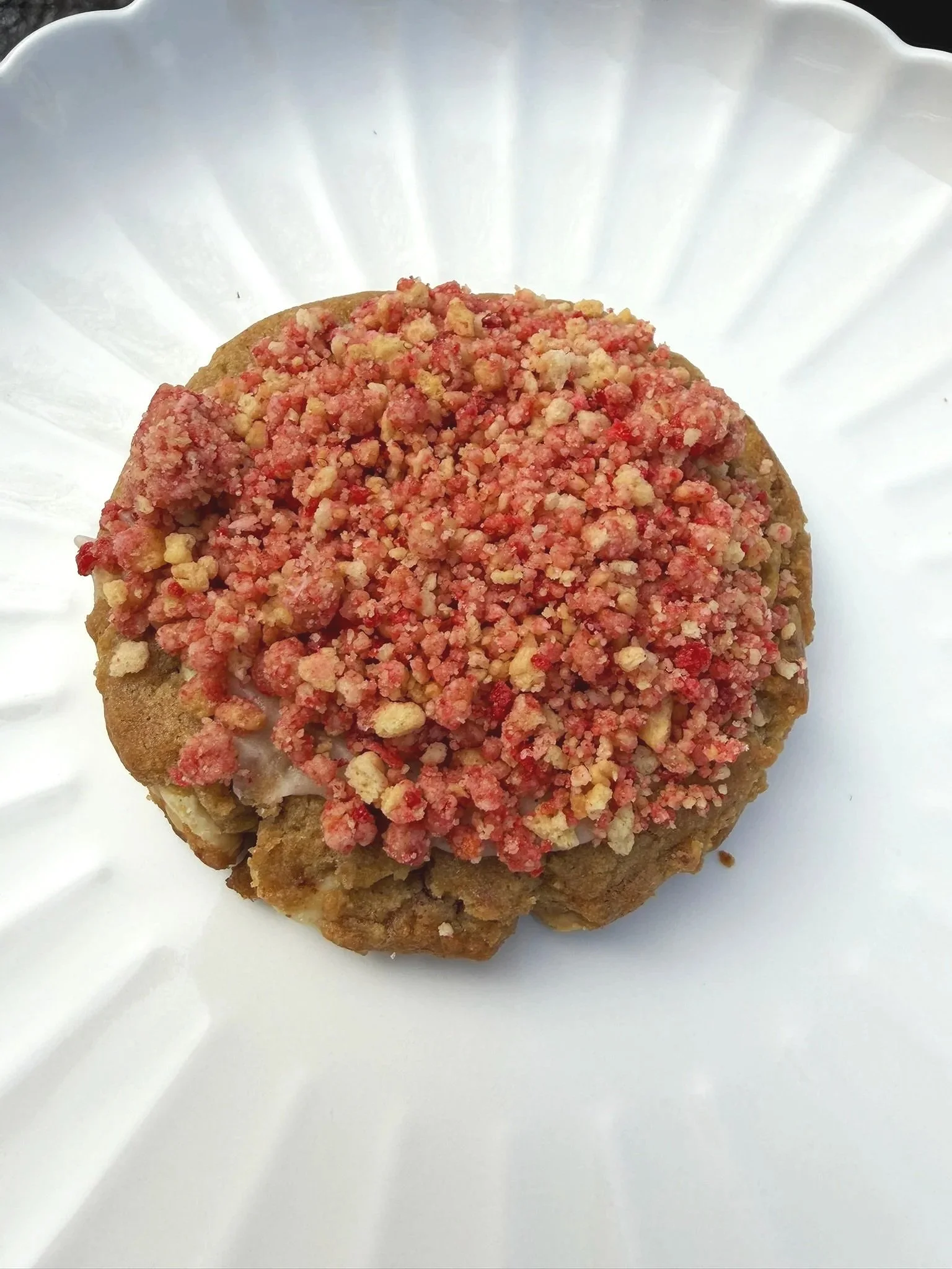 Sweet strawberries and creamy white chocolate come together in a soft cookie, topped with a buttery strawberry crumble for that classic strawberry shortcake finish